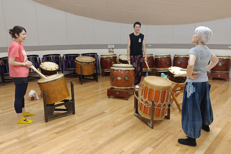 今日の練習内容は明日予定に入っている敬老会のイベント演奏のための曲を中心とした通し練習だった。スタイルは3名とも低音パートのアフリカン打楽器のような太鼓と高音パートの締太鼓を組んだ組太鼓スタイルであった。