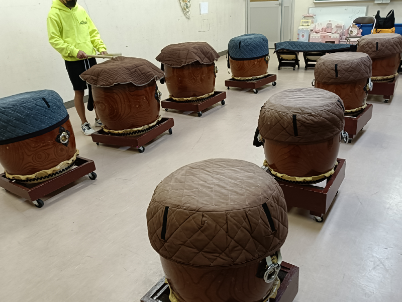 当仁太鼓も同じく音の問題に悩まれていましたが、「太鼓カバーをミュート(消音材)として活用する」という工夫で、見事に解決されていました。