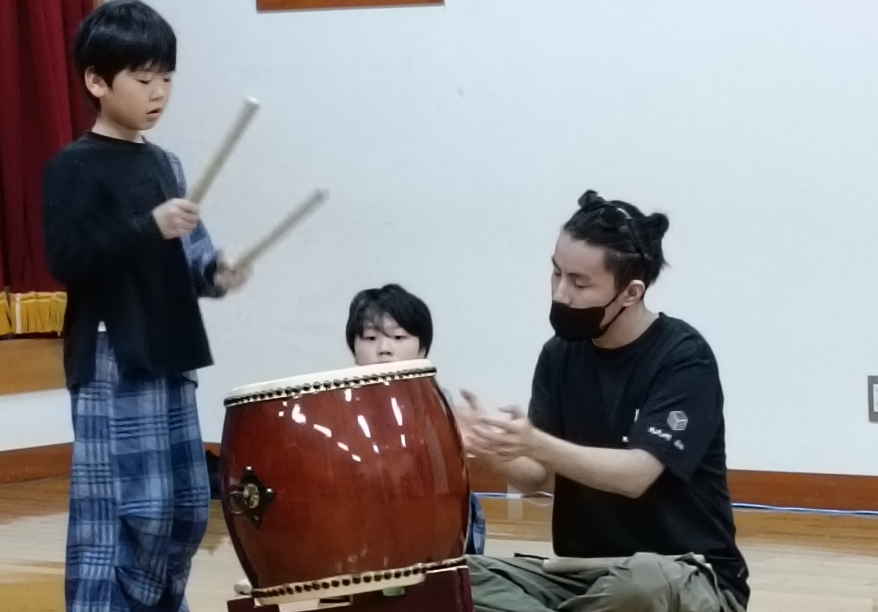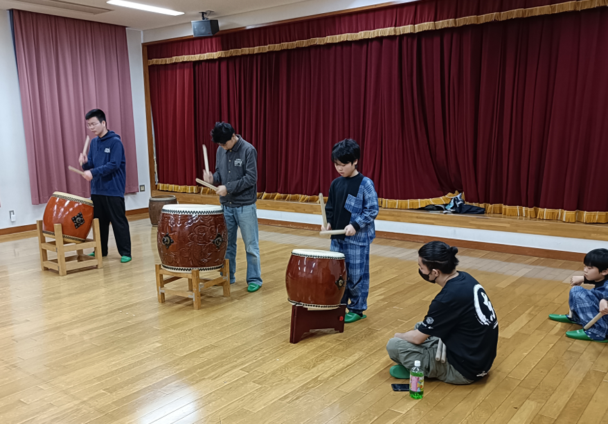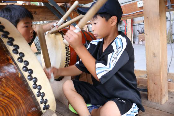 小さな手でバチを握り、先輩の音に真剣に耳を傾ける姿。その瞳には、すでに祭りの熱気が宿っているようでした。