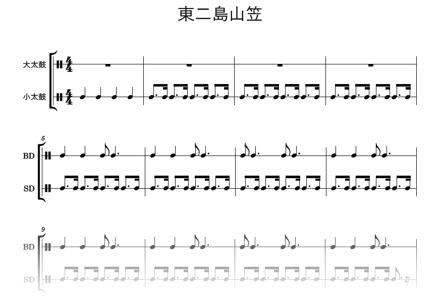 低音がメロディライン(主奏)を受け持っているため、聴感上、一般的な和太鼓や小倉のスタイルとは逆の構成で聞こえてきました。